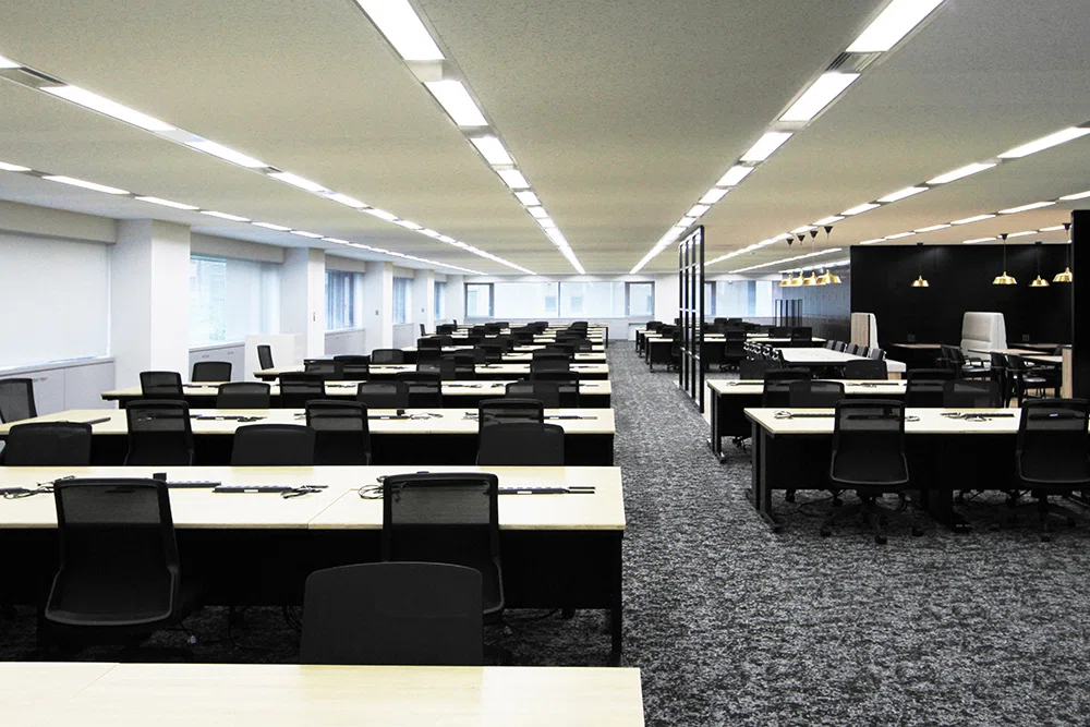 執務室はワンフロアに集約されており、気軽にコミュニケーションを取ることができます。1人1人のデスクが広く、集中しやすいワークスペースになっています。