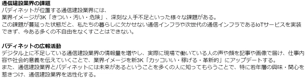 これはバディネットの広報活動のテーマなのですが、着目していただきたいのは、当社バディネットだけではなく、通信建設業界までもオープンにしていくというところです。