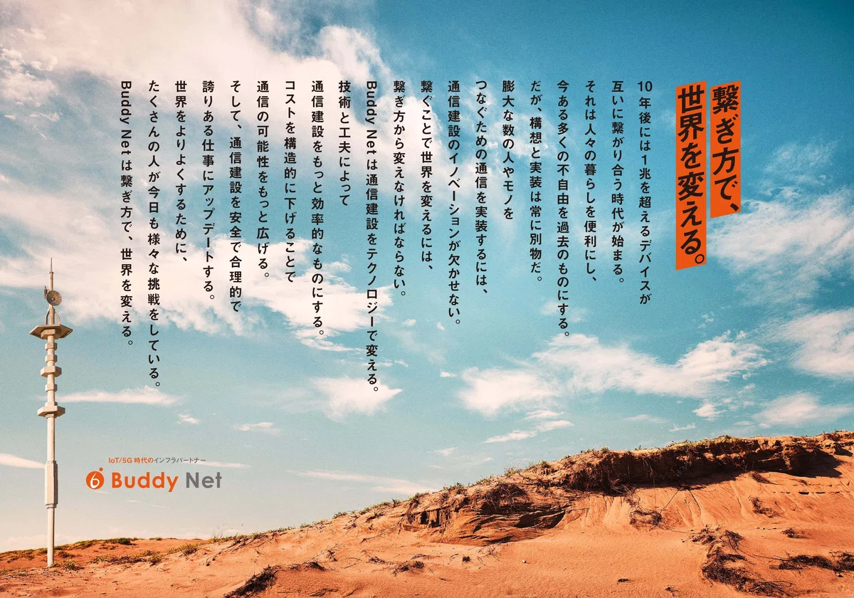 『バディネットは、携帯電話やスマートフォンなどの無線通信を可能にする設備である携帯基地局の設置、補強、補修工事&工場や病院、空港のターミナルビルなど、電波状況が悪い場所に電波改善工事を行っている』