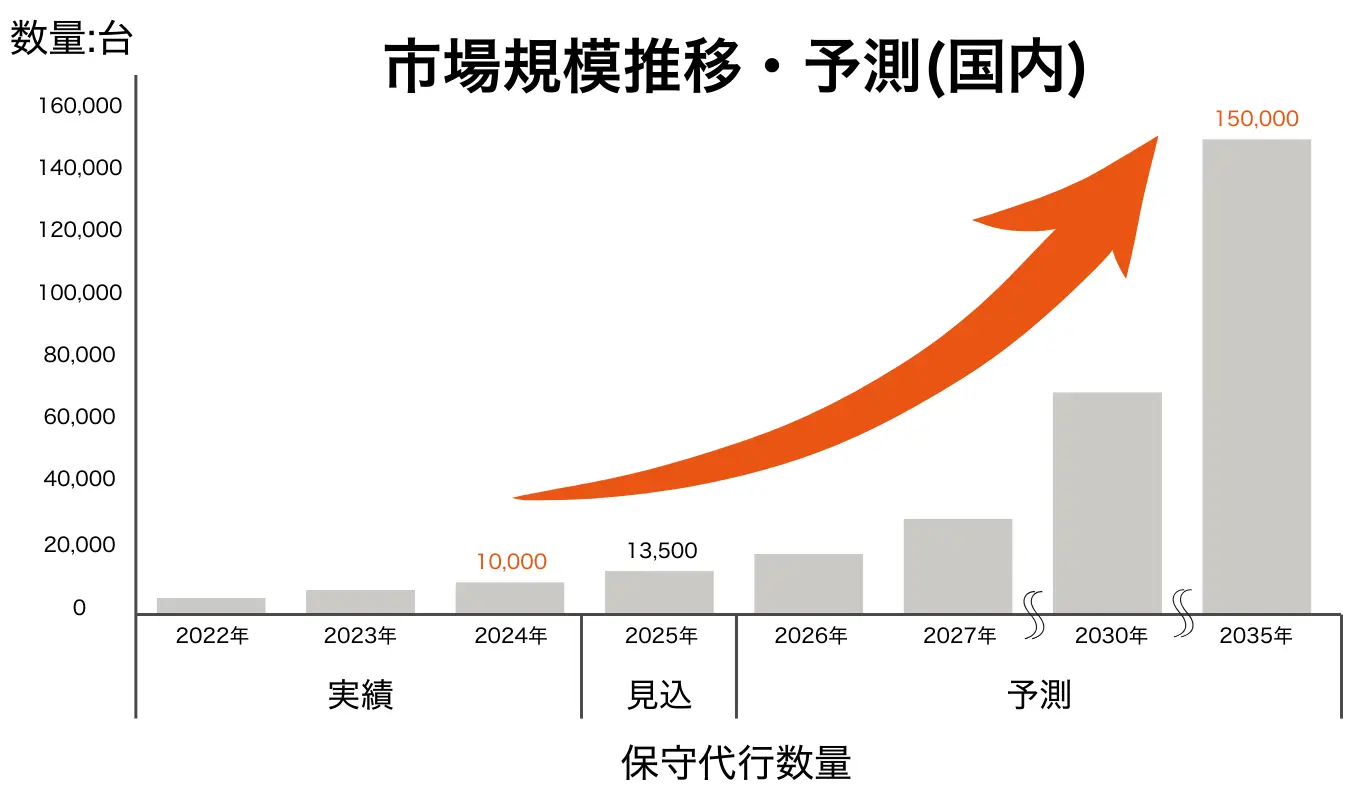 富士経済の調査では、今後とも保守代行サービスのニーズが大きく高まることで、サービスロボット保守代行数量は2024年実績の1万台から2035年には15万台に到達すると予測されており、導入・アフターサポート体制のさらなる整備が急務となっています。