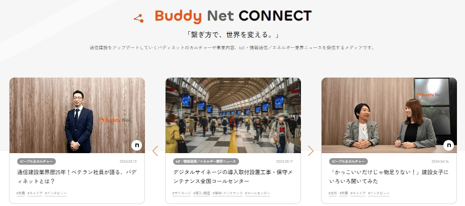 バディネットのカルチャーや事業内容、IoT・情報通信/エネルギー業界ニュースを発信する「Buddy Net CONNECT」を開設しました。「通信建設業界とバディネットを、もっとオープンに。」をテーマに、皆さまに身近な存在として感じていただくこと目指していきます。